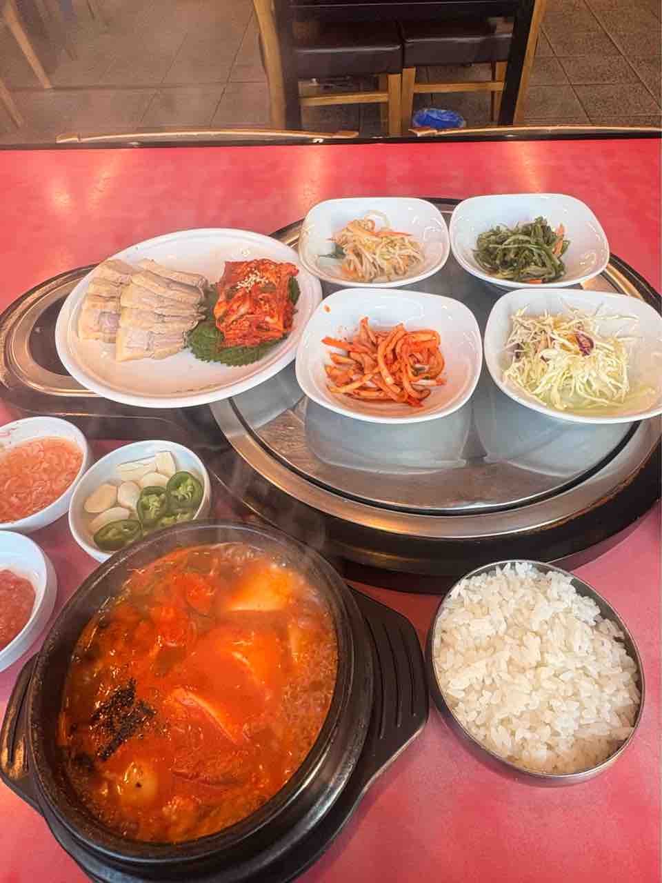ショッピングはこんな感じで、お昼ごはん兼晩ごはんはノルブプデチゲの海鮮スンドゥブとポッサム定食にしました。